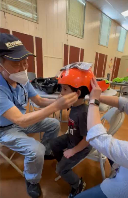 The Club purchases bike helmets for kids at the Whitaker Elementary School Head Start. Club members work to fit helmets to each kid.